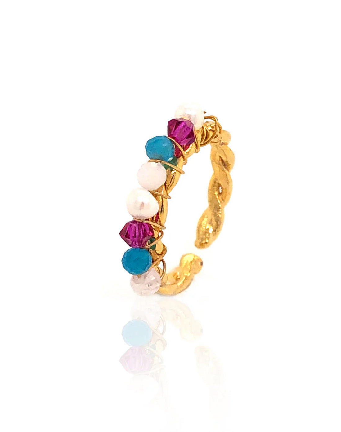 Anillo hecho a mano con baño de oro 18K. Piedras semipreciosas de colores y perlas de agua dulce.