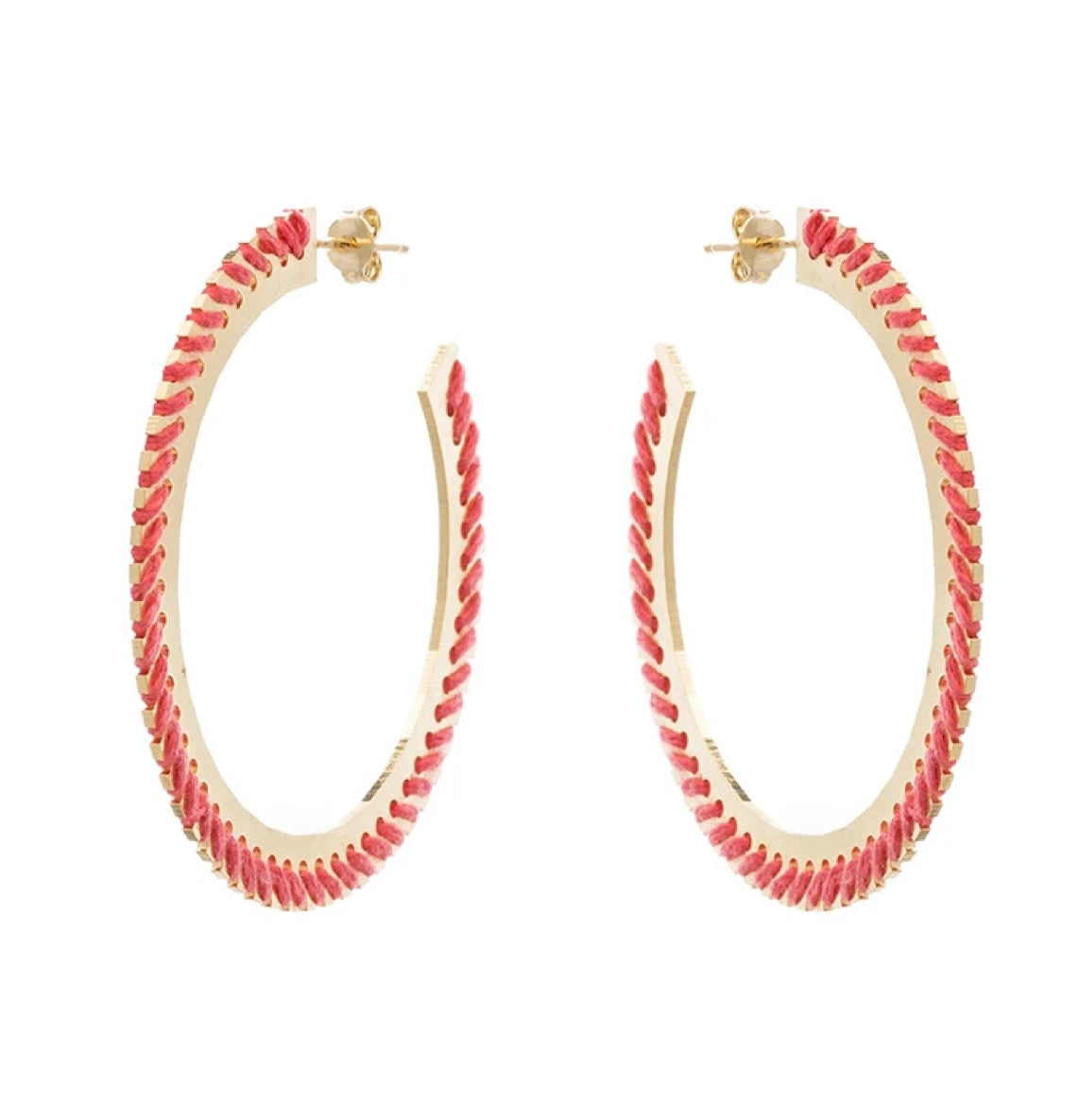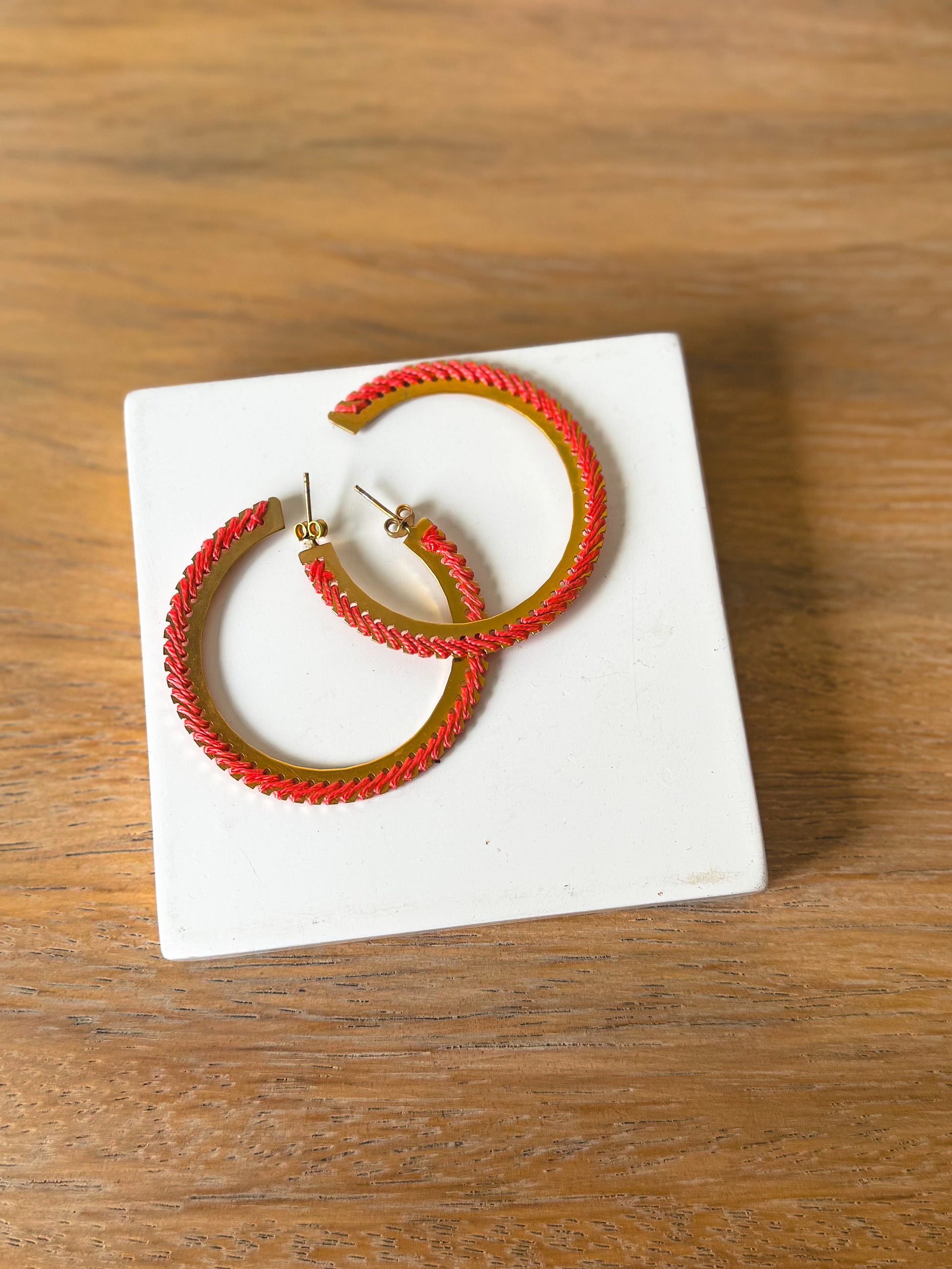Aretes hechos a mano con baño de oro de 18k. Tejidos con hilo coral.