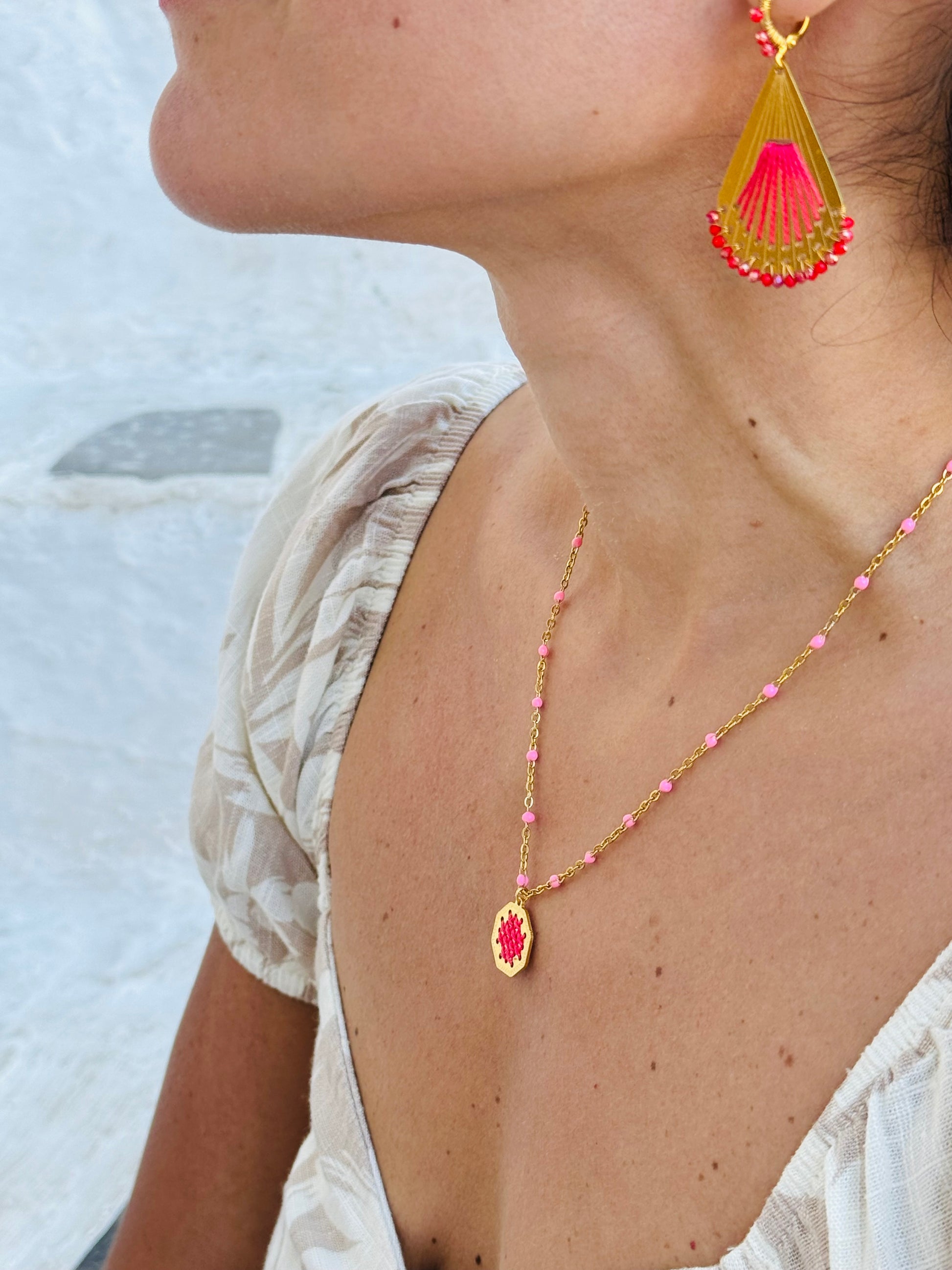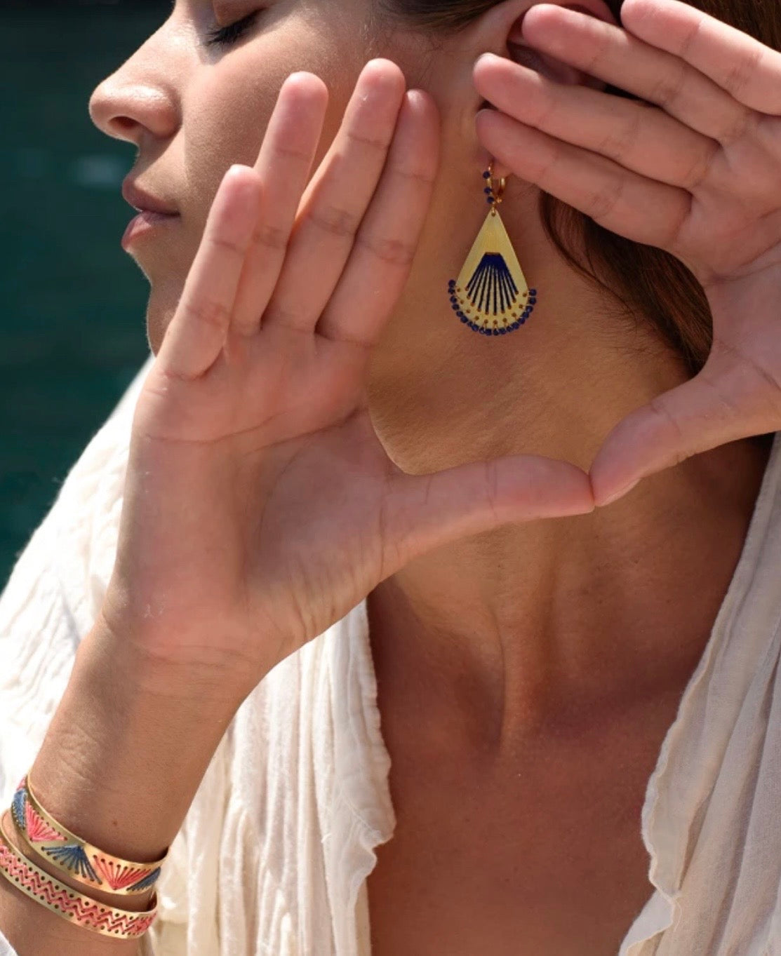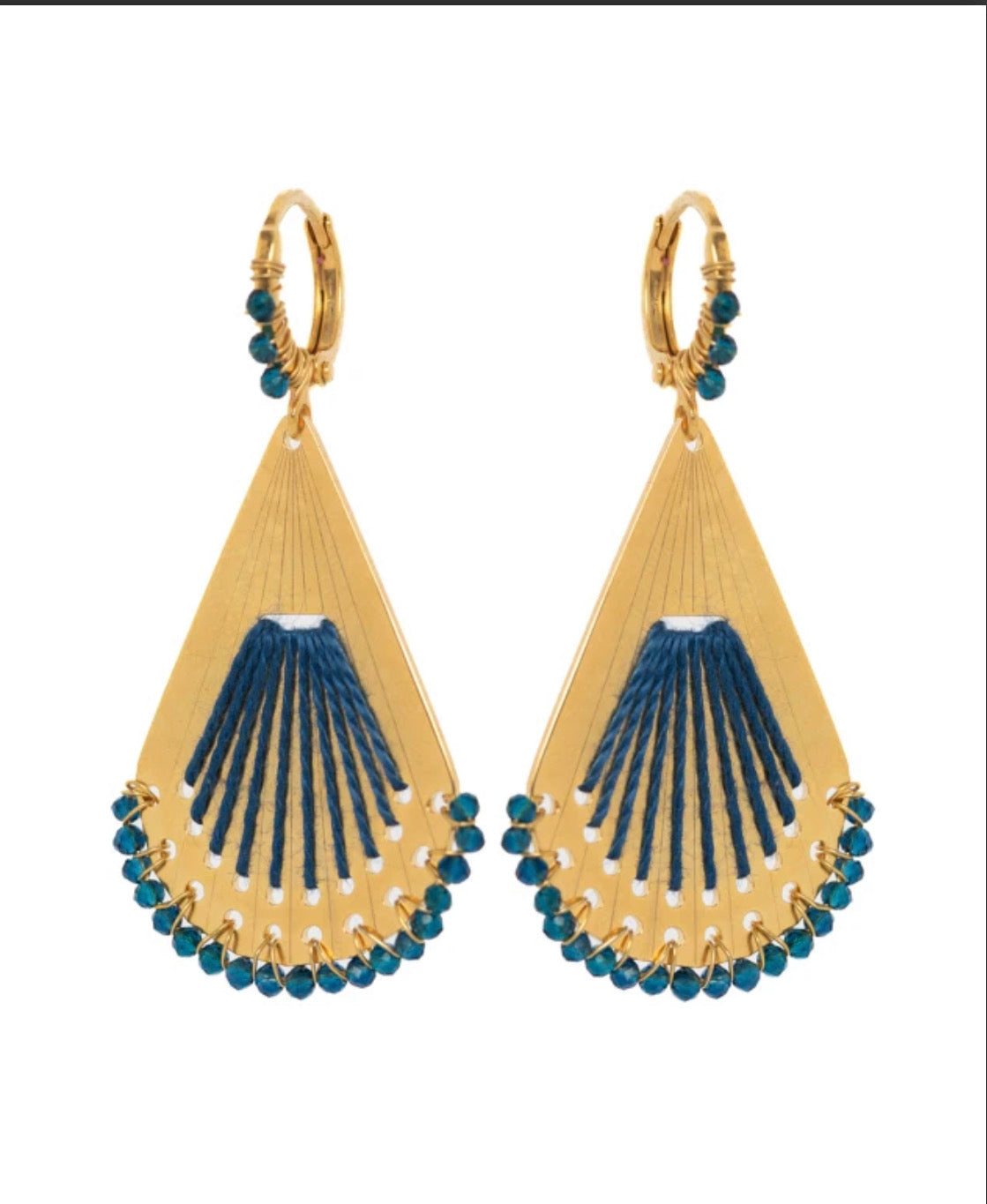 Aretes hechos a mano con baño de oro, bordada con hilo y piedras.