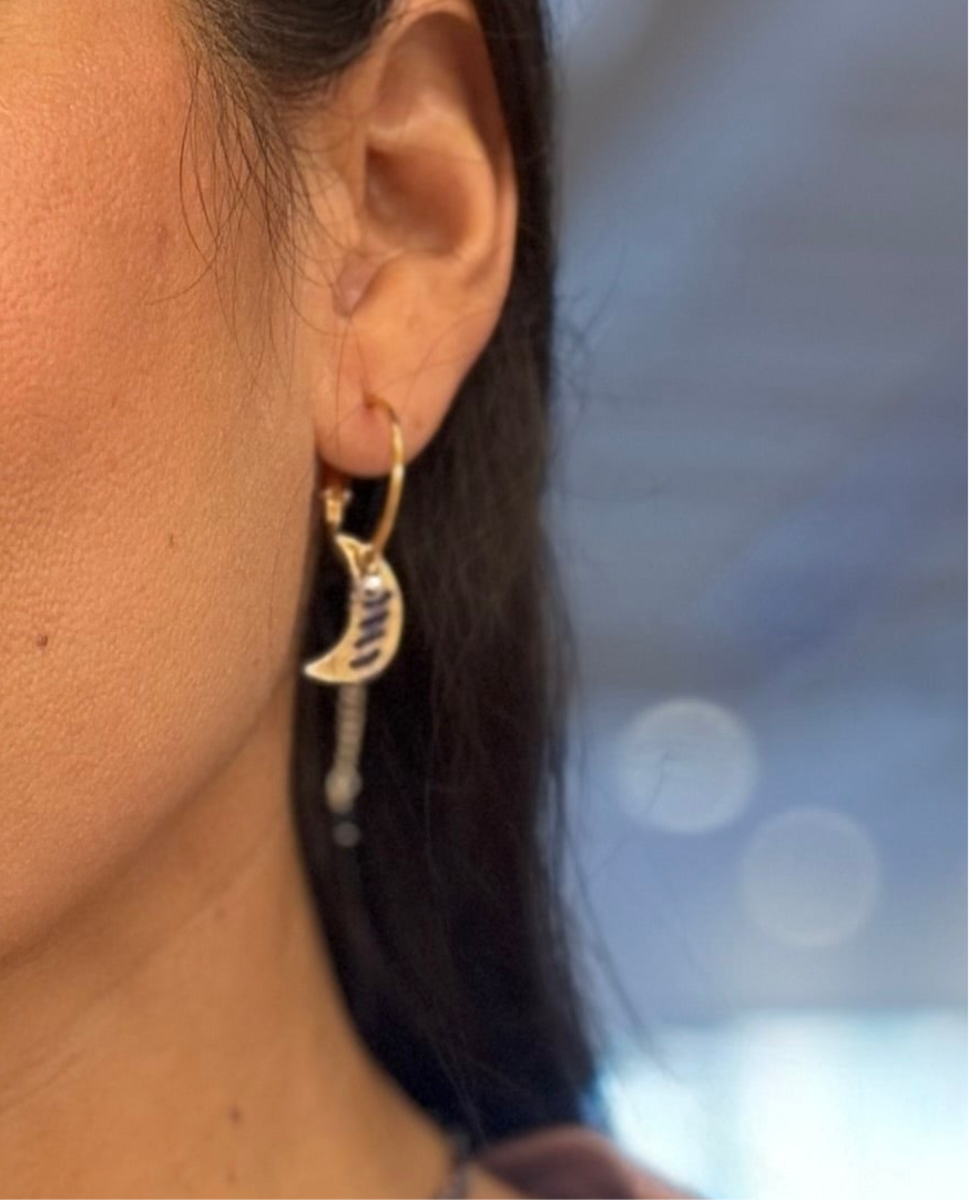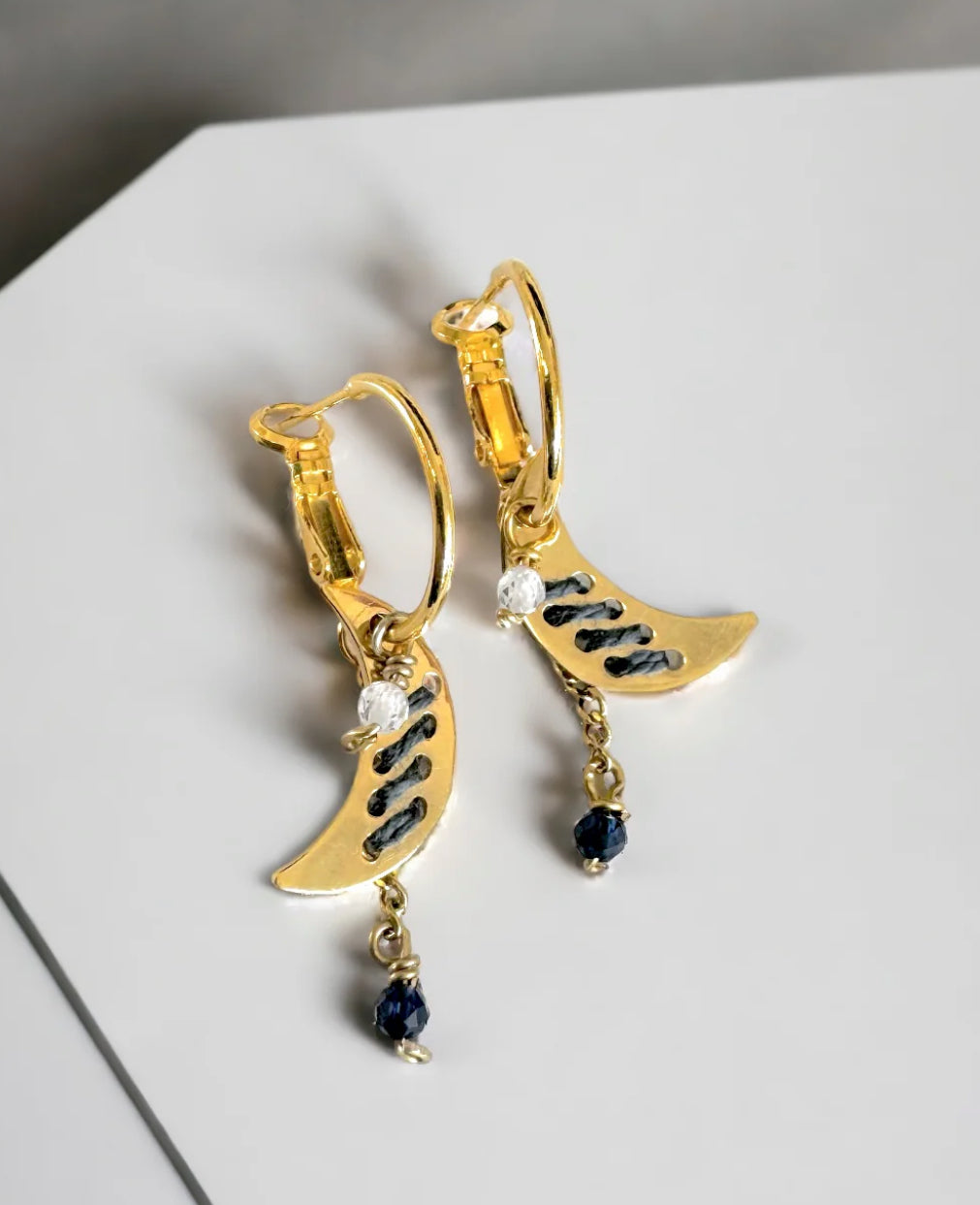 Argollas tejidas a mano con hilo gris bañadas en oro 18k.
