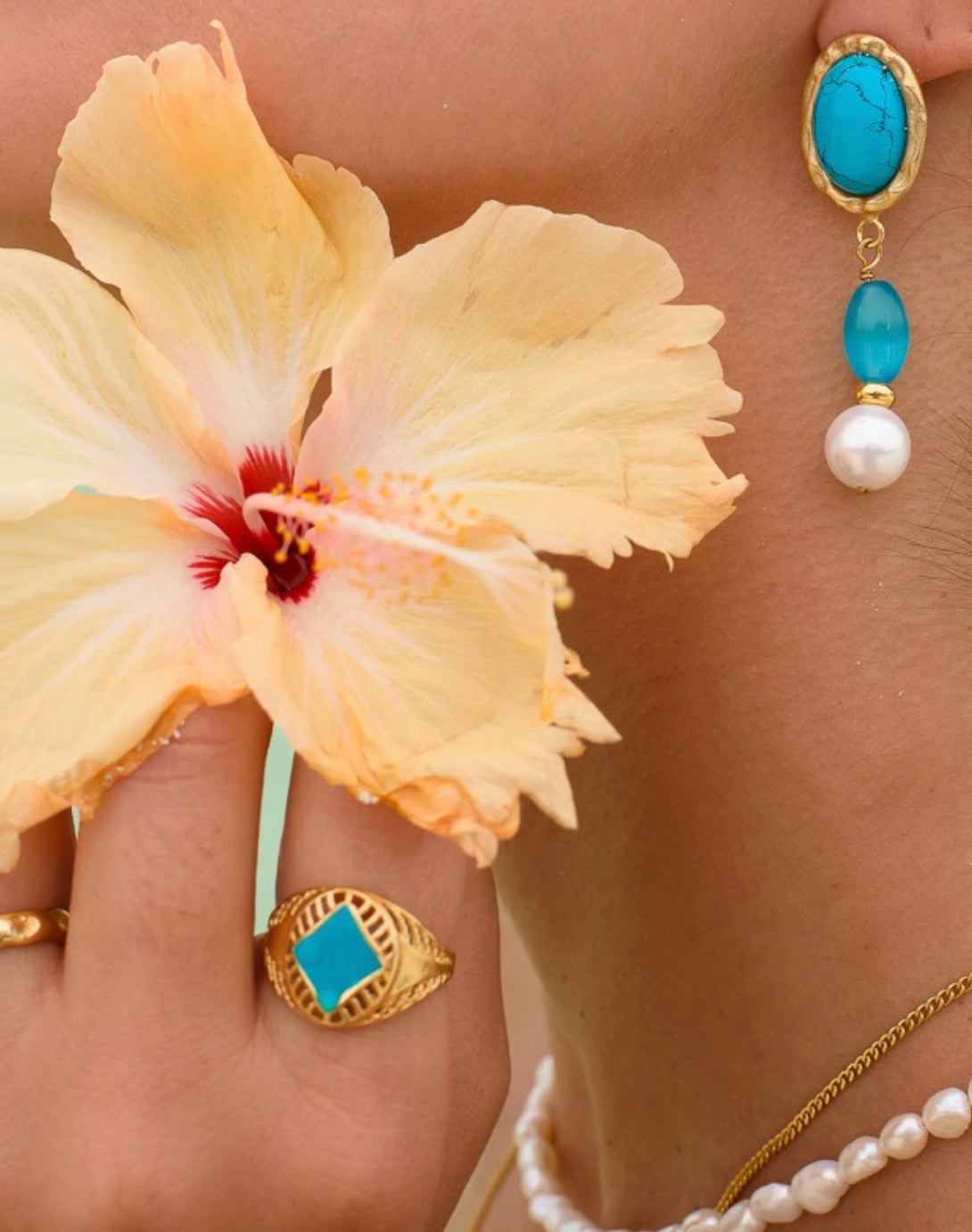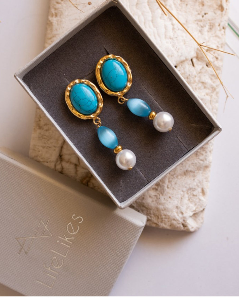 Aretes artesanales con piedra semipreciosa turquesa y perlas de agua dulce.