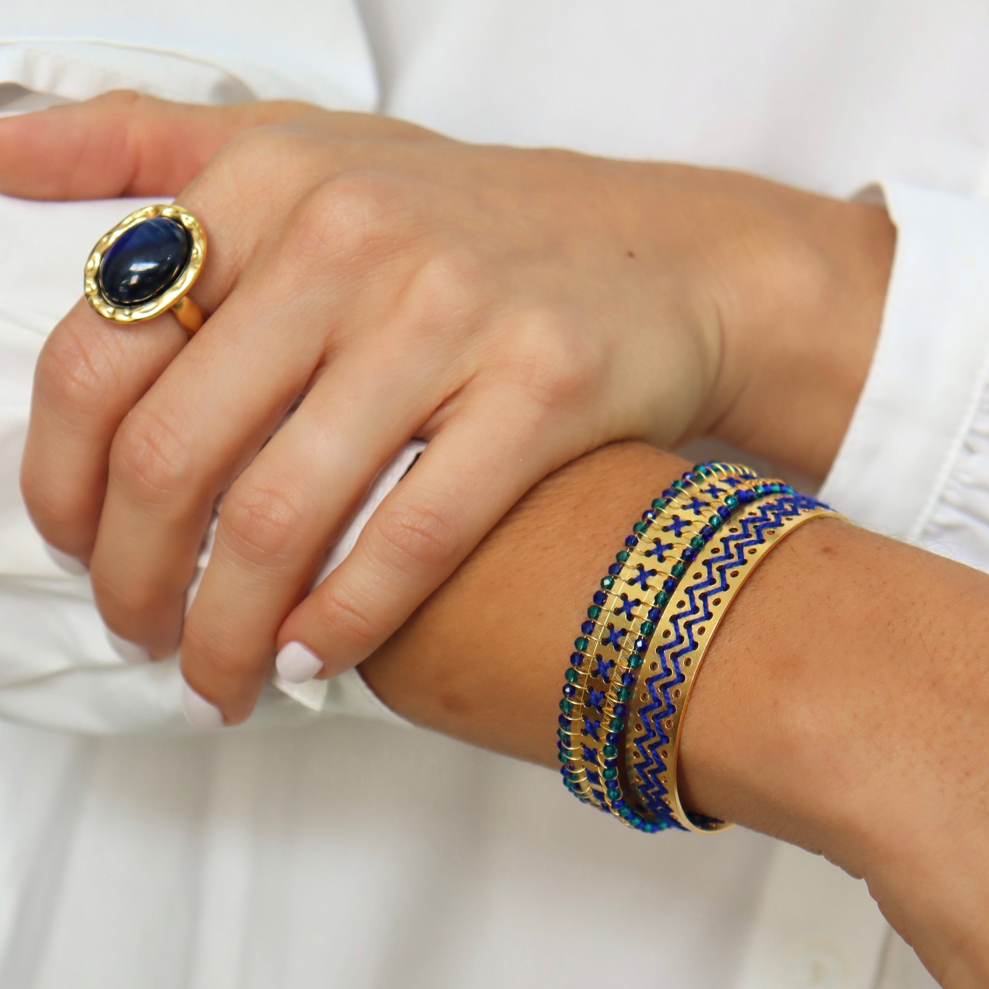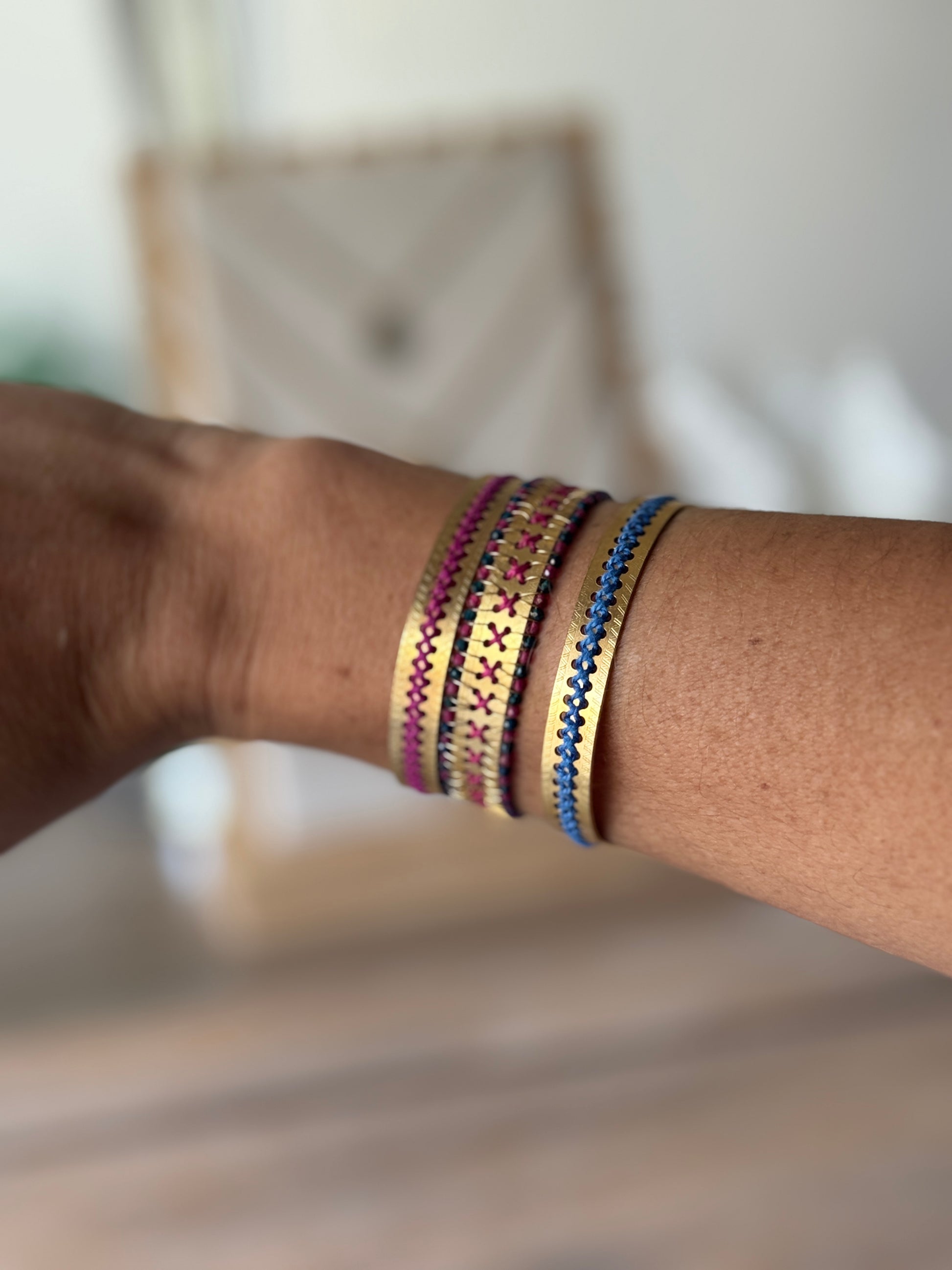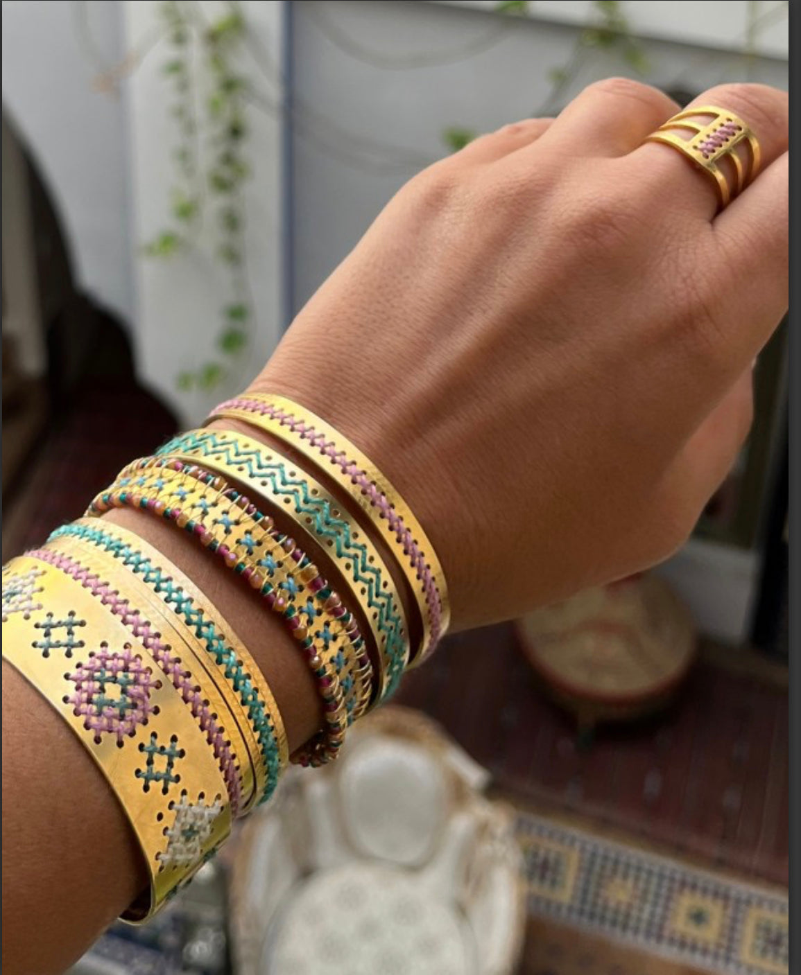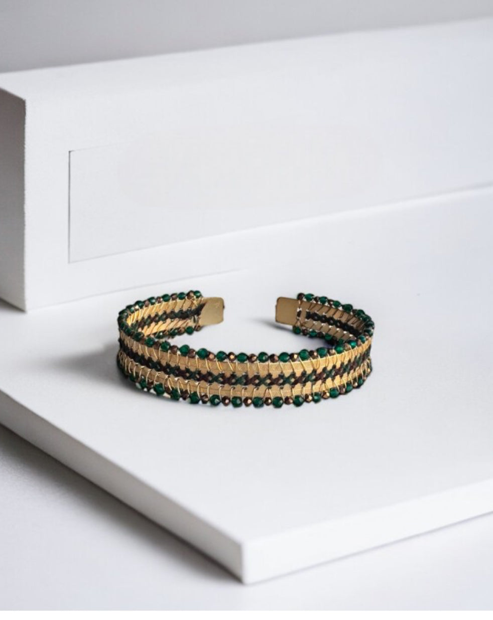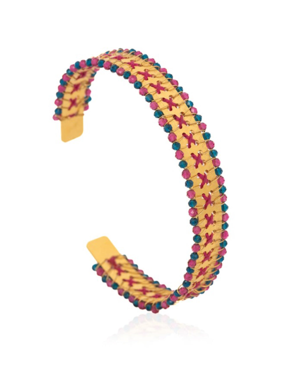 Pulsera hecha a mano con baño de oro de 18K. Bordada con hilos de colores y piedras decorativas.