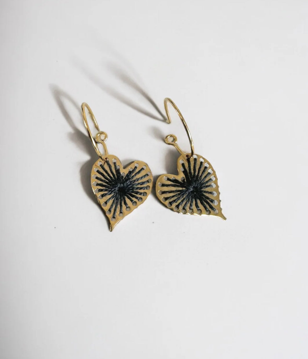Aretes bañados en oro 18K. Bordados a mano con hilo gris.