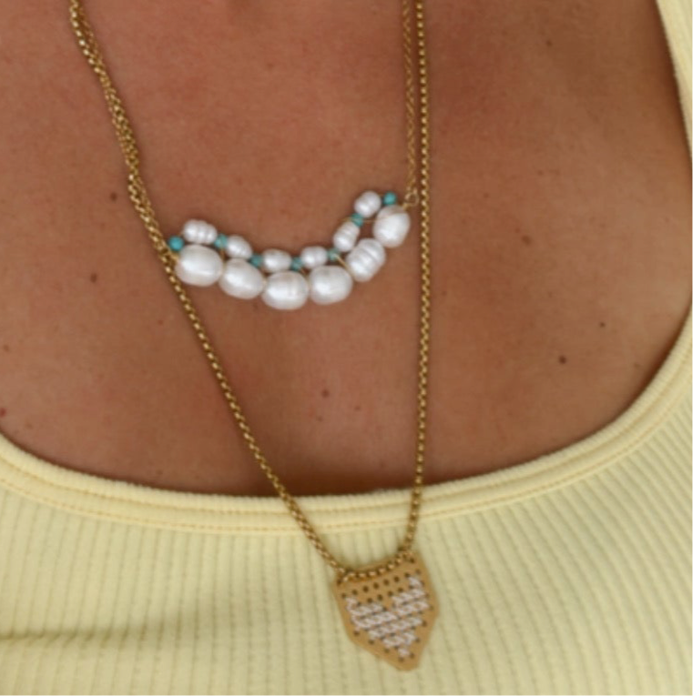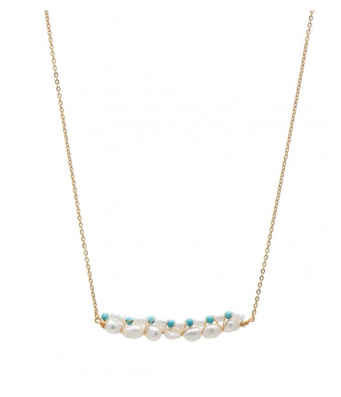 Collar hecho a mano con cadena metálica bañada en oro 18K, decorada con perlas de agua dulce y pequeñas piedras turquesas.